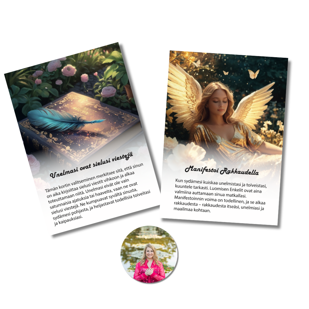 ”Tämä yhdistelmä on muuttanut elämäni! Enkelikortit tarjoavat uskomattoman viisaita viestejä, ja kun ne yhdistää päiväkirjatyöskentelyyn, se tuntuu kuin keskustelulta korkeampien voimien kanssa.” – Minna